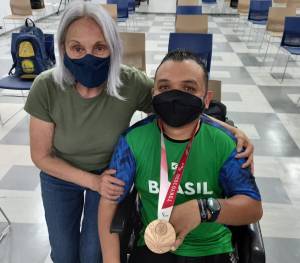Inês Paz ao lado do atleta Maciel Santos, medalhista paraolímpico, na bocha em Tóquio.