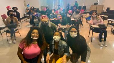 A taxa de inscrição do workshop foi um pacote de absorventes, para ajudar a combater a pobreza menstrual.
