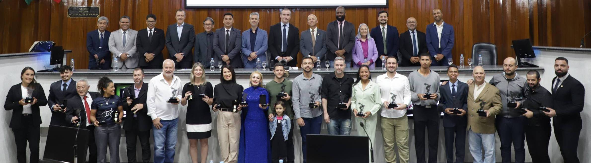 Noite de 5 de setembro. Plenário da câmara. Comemoração da semana do profissional de educação física. Destaques receberam medalhas e troféus por seus trabalhos prestados a população.