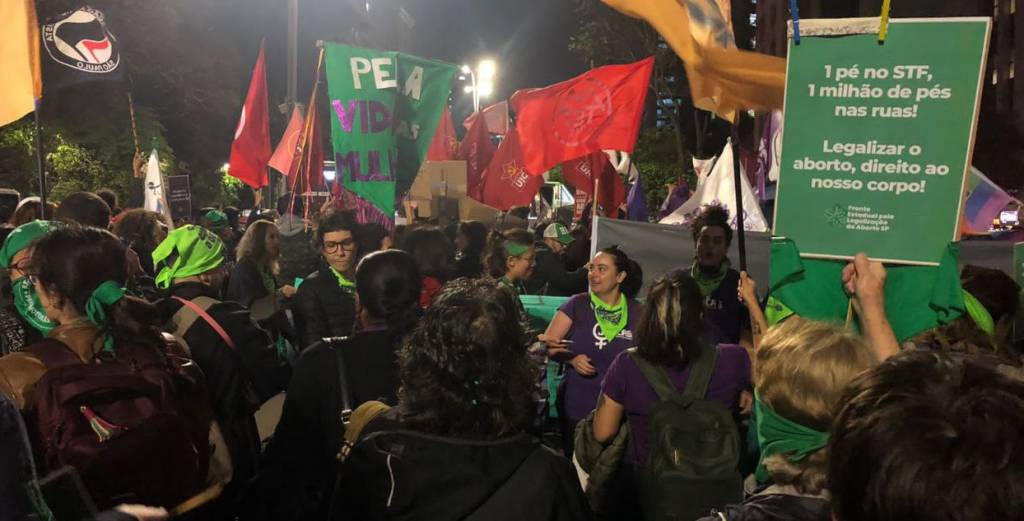 Dia 28 de setembro. Final de tarde. Vão do MASP, SP. Mulheres se reúnem e caminham até a praça Roosevelt, exigindo o direito de decidir o que fazer com seu próprio corpo.