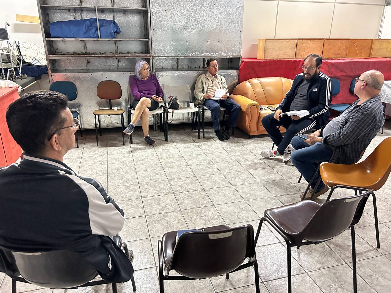 Com objetivo de avaliar as ações do movimento em 2024 e conversar sobre política, Inês Paz, o Diácono Pedro (Cáritas Diocesana); Chiquinho (P. Operária); Arnaldo (P. Operária); Cauê (PSOL) e Gilson (Comissão Justiça e Paz) se reuniram na sede do Cáritas Diocesana de Mogi das Cruzes na R. Maj. Pinheiro Franco, no Centro.