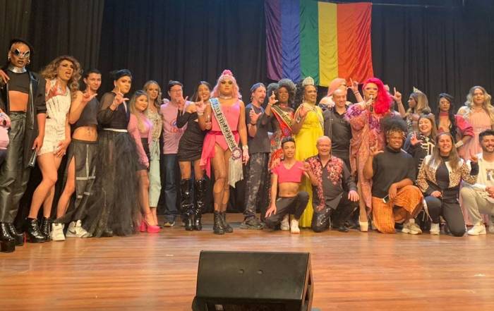Theatro Vasques: palco do 3º Concurso Miss Drag Queen Da direita para a esquerda: Vivian Dilaurients, Regina Tavares - presidenta do Forum Mogianao LGBT e Mell
