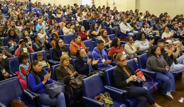 Encontro tira propostas para Mogi, para o estado e para a nação Lema da Conferência e Henriette Fraissat a direita. Dia 7 de junho. Auditório