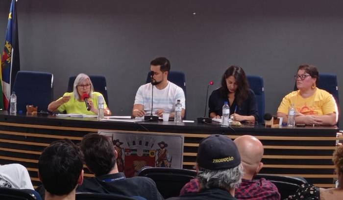 Secretaria de cultura apresenta suas contas Na mesa da esquerda para direita: Inês Paz, Bi Gêmeos, Dani Anjos e em pé Claudinéli Moreira. Dia 04/05